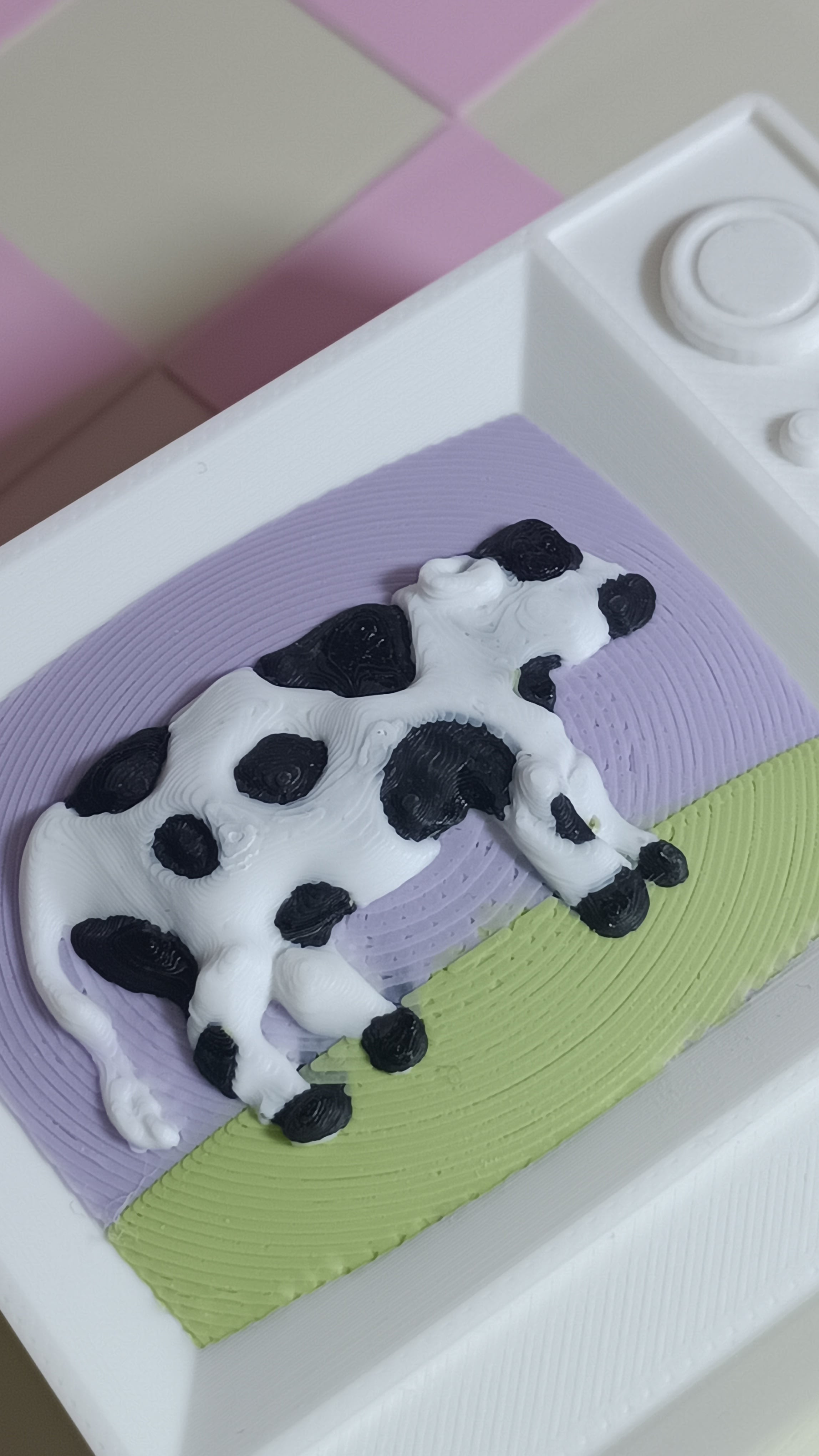 テレビ画面に映る牛さんはレリーフ状になっています。